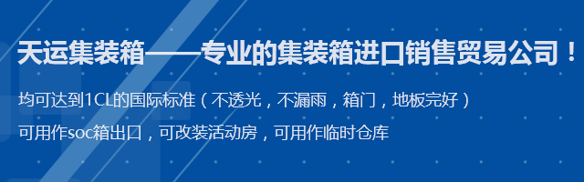 青島天運集裝箱服務有限公司,是專業的集裝箱進口銷售貿易公司,公司與各大船公司租箱公司保持著密切的合作關系,箱源充足,所有出售集裝箱均可達到IICL的國際標準(不透光,不漏雨,箱門,地板完好)可用作soc箱出口,可改裝活動房,可用作臨時倉庫。